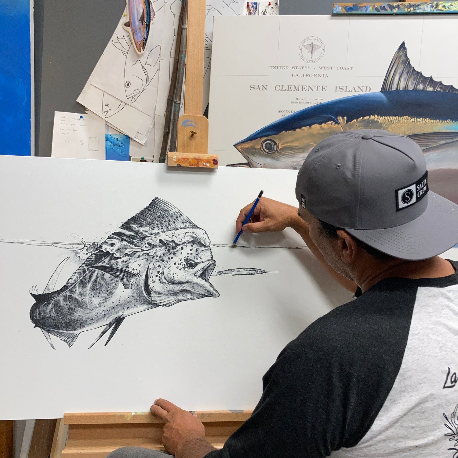 A California-based artist and educator specializing in marine science illustration. As a native son of California’s central coast, Amadeo drew early inspiration from family traditions of fishing, coastal gatherings, and from his family’s old copy of The Lore of Sportfishing. He has works published by National Geographic, United Nations, Scientific American, CA Department of Fish and Wildlife, among others. We are honoured to have his amazing art featured on many of our tees and sweatshirts.