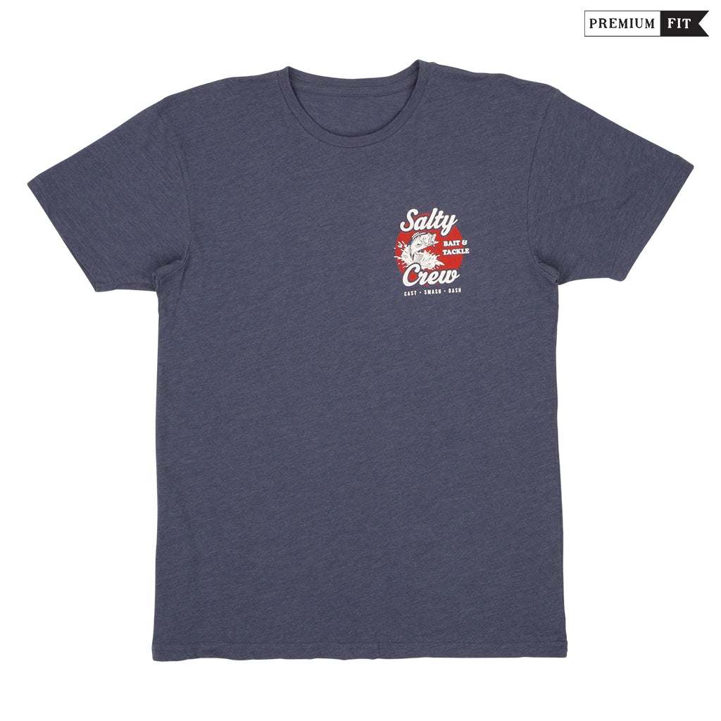 The Bait And Tackle S/S Tee in navy heather is a premium slim fit short sleeve t-shirt with screen printed front and back. Made from 100% cotton 30 singles combed ringspun. Available in sizes: S, M, L, Xl, XXL