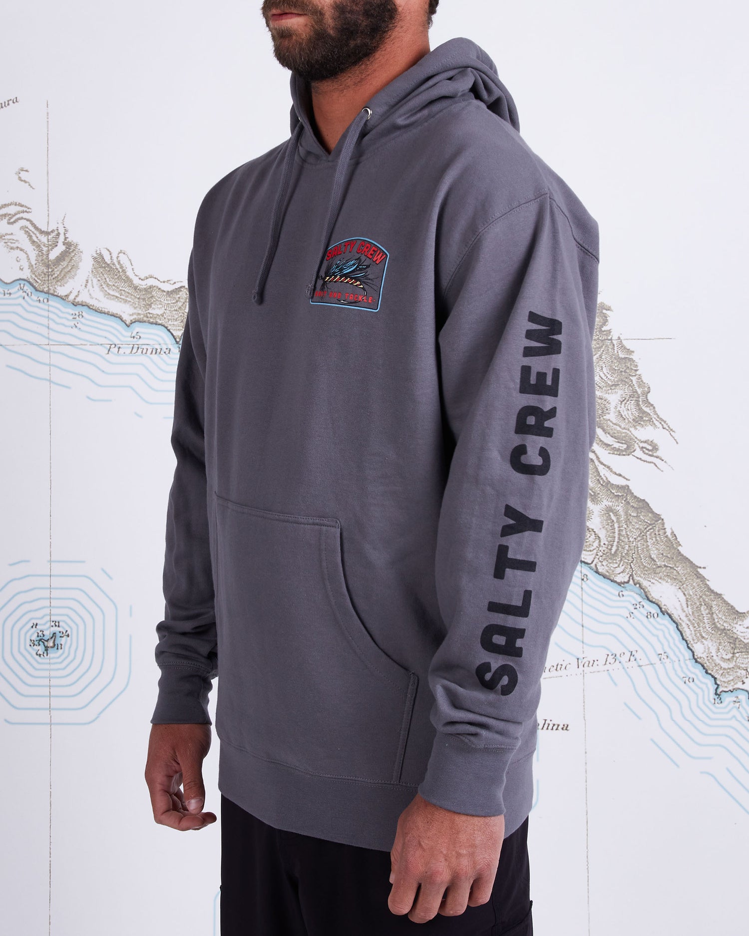 Fly Dropp Hood Fleece in Charcoal. Mid Weight 8.5oz, hoodie with Kangaroo pocket. Featuring custom Salty Crew screen printed front, back and sleeves.