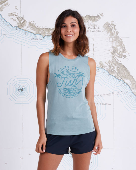Go Fish Muscle Tank in Sage green. Light weight tank featuring custom Salty Crew print on front.