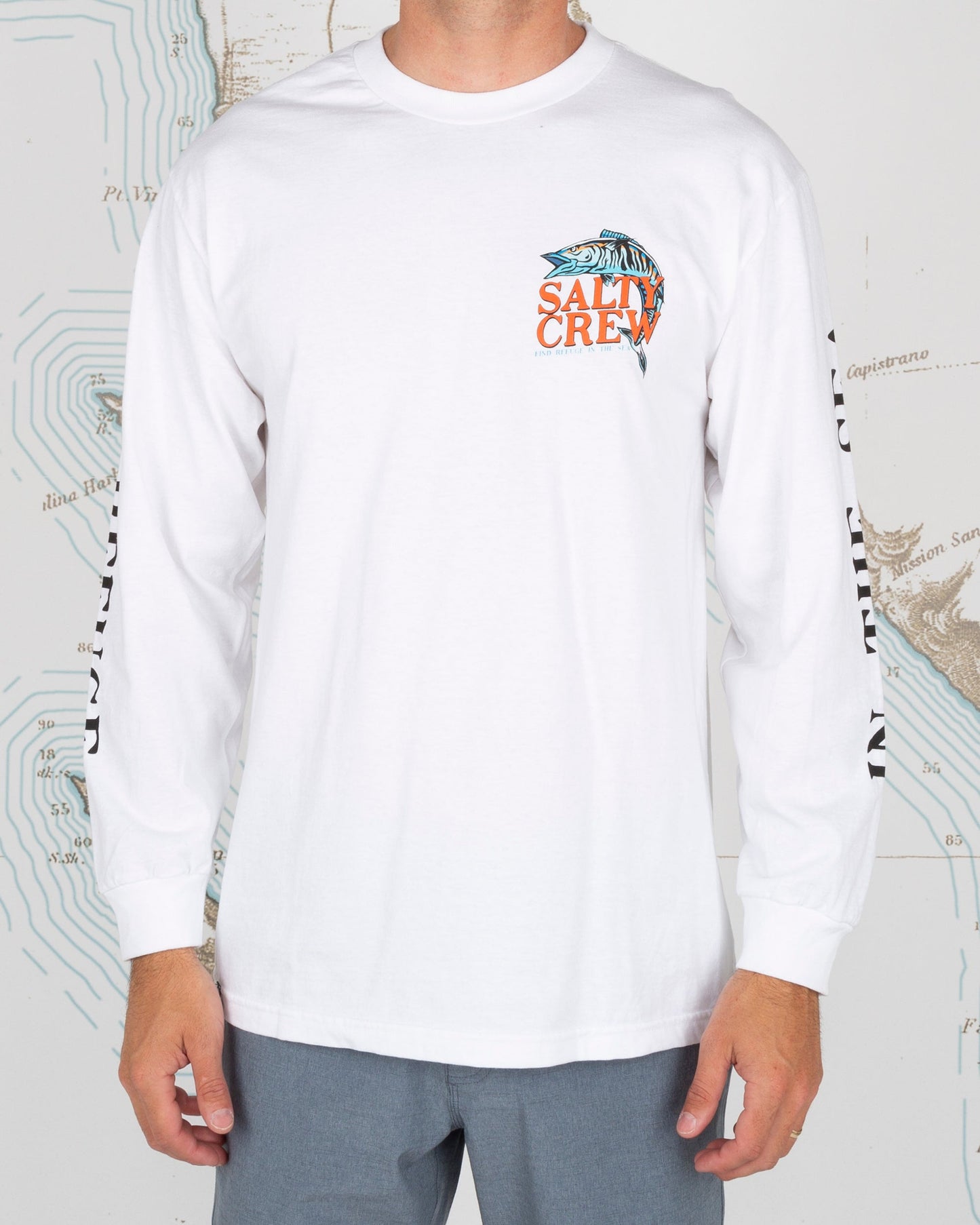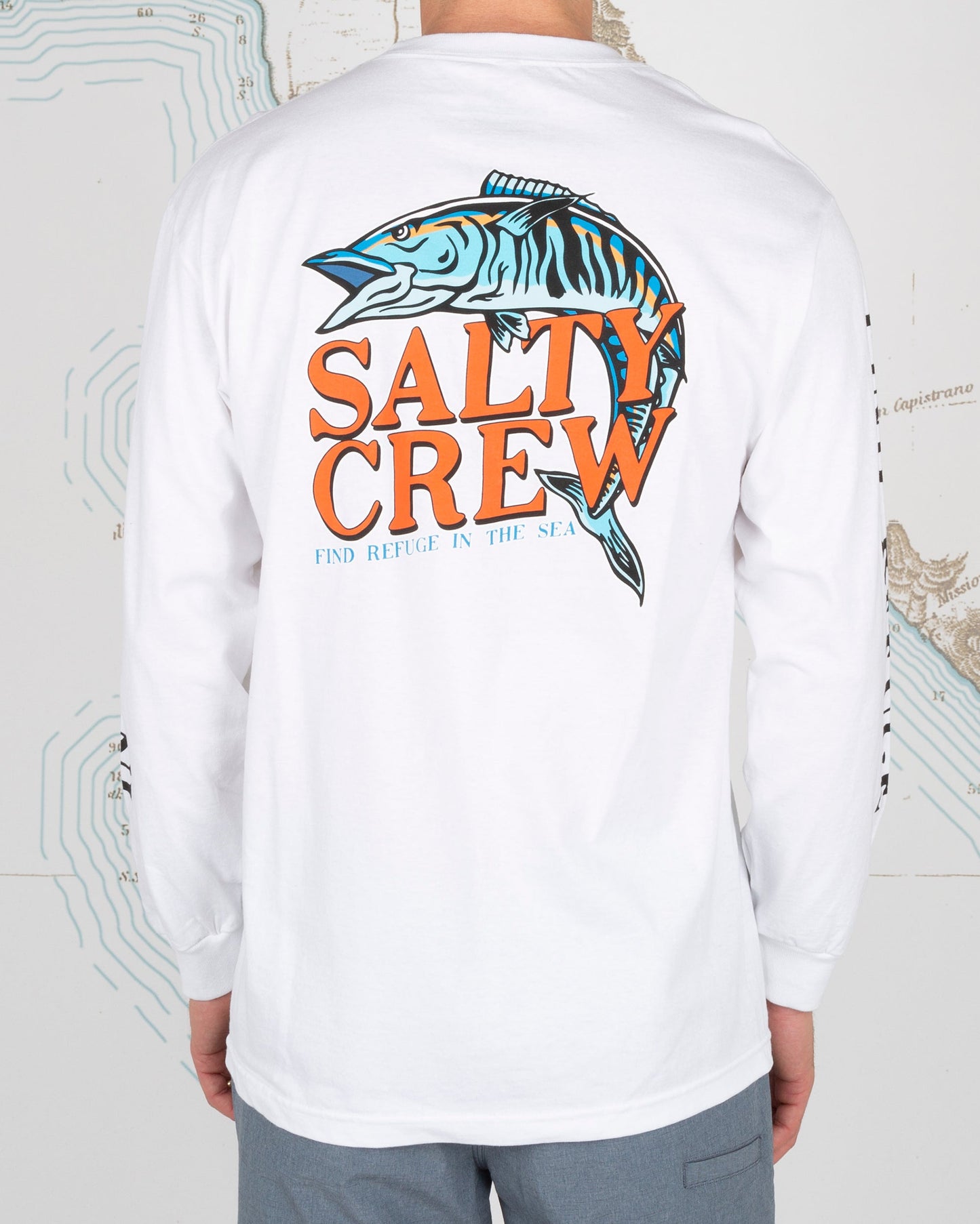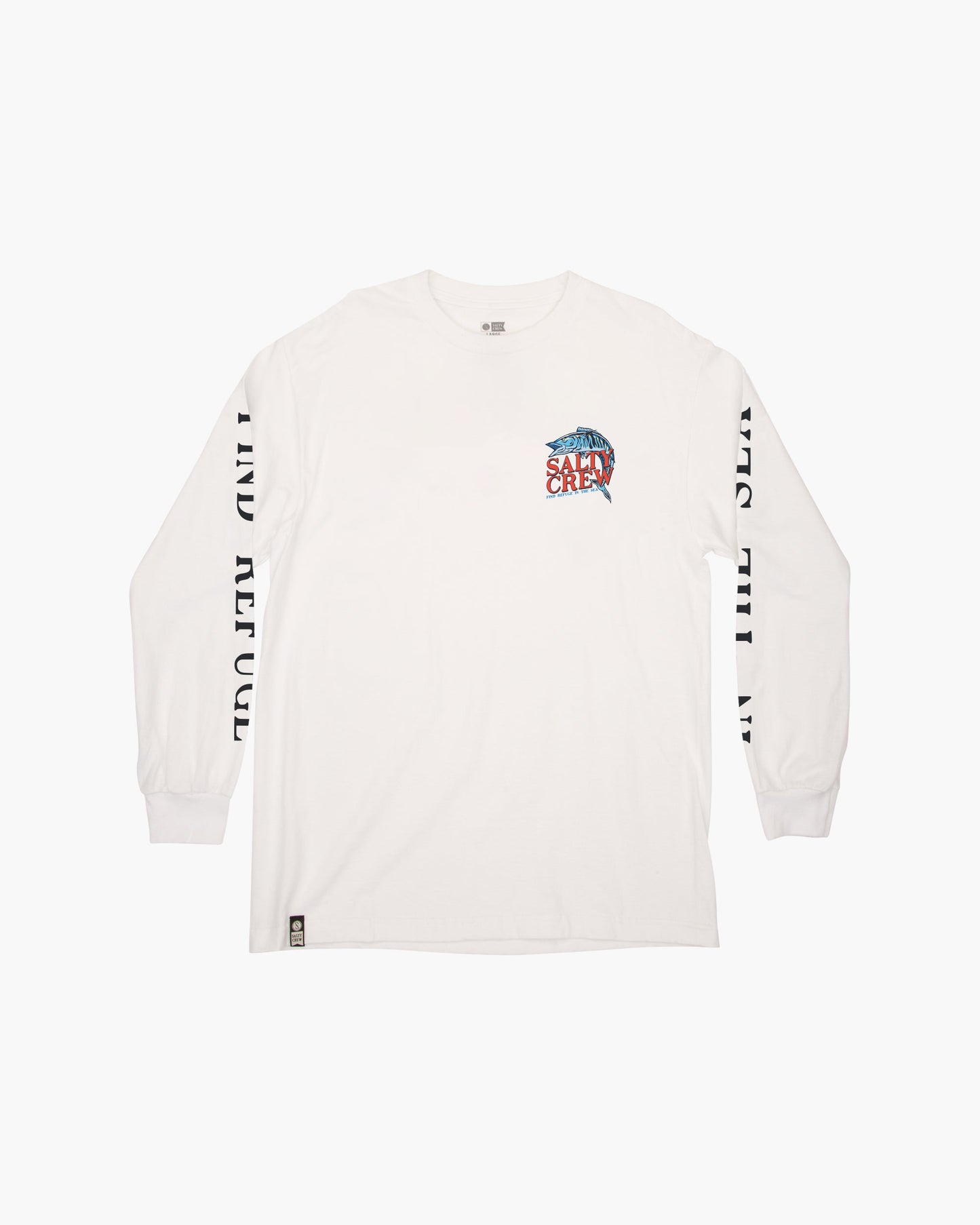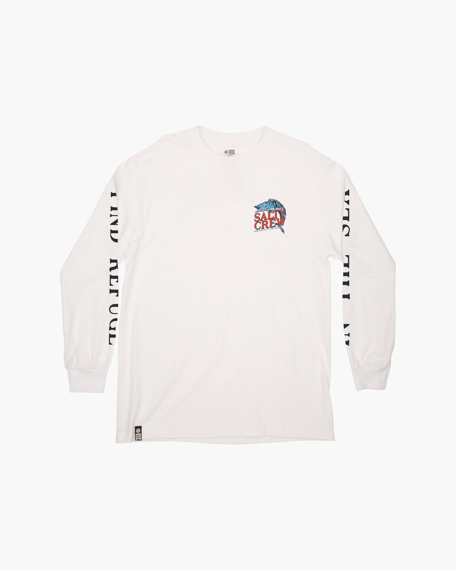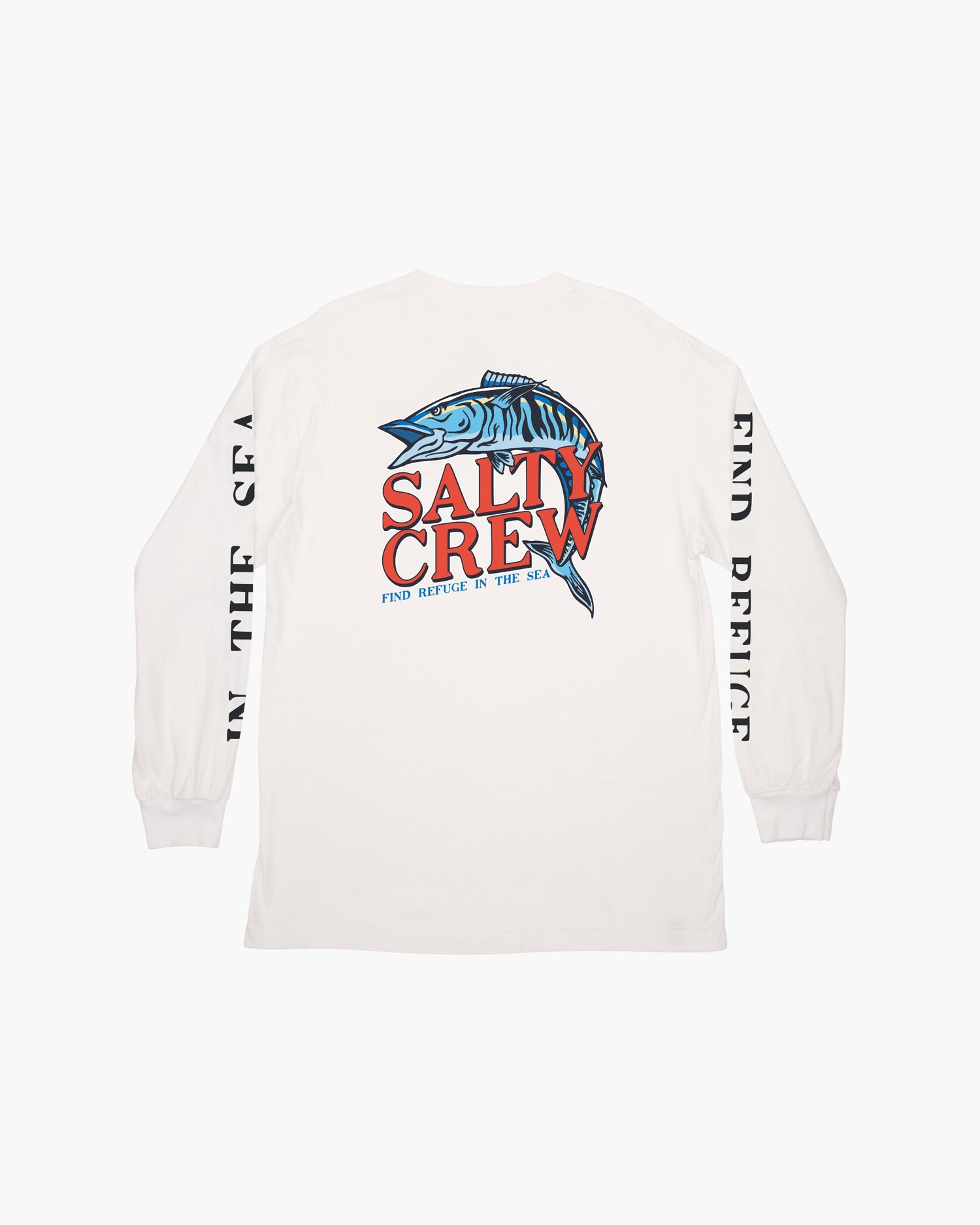 Oh No L/S Tee in White. Long Sleeve tee made from 100% cotton. Featuring custom Salty Crew screen print on the front, back and sleeves.