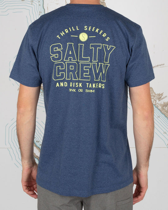 Spinner Standard S/S Tee in Navy Heather. Made from 100% Cotton, 22 Singles Soft Spun. Featuring custom Salty Crew screen printed Front and Back.